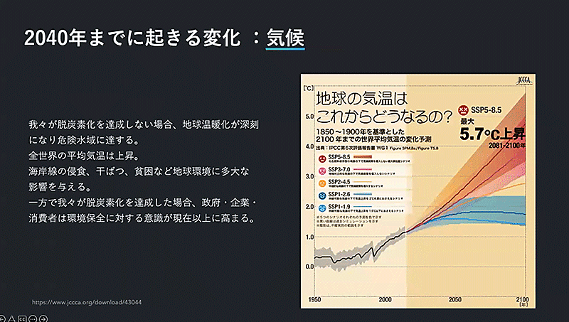 次に気候の問題。全国地球温暖化防止活動推進センターのデータによると、21世紀半ばにCO2の排出量がゼロになるという最善のシナリオを迎えることができたとしても、2021年から2040年に平均気温は約1.5℃上がるという。全世界の平均気温が上昇すると、海岸線の浸食や干ばつ、貧困など多大な影響を与える。そのため脱炭素化は、切迫した問題と言える。
