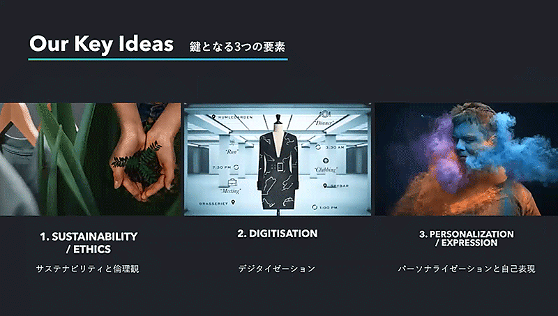 2つ目は「デジタイゼーション」。デジタルシフトの波はファッション業界にも起きている。生産など製造工程におけるデジタル化、あるいはユーザー向けにRFIDタグの導入などデジタイゼーションは今後大きな鍵となる。