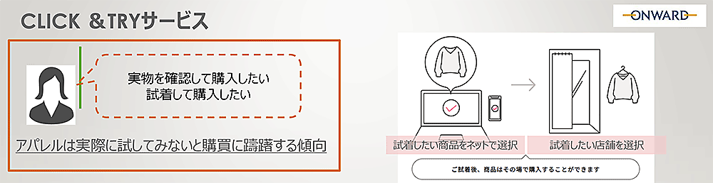 そこでオンワードが全国に展開する店舗網を生かし、ECサイトを通じて店舗での試着を申し込める「CLICK&TRY」サービスを始めた。現時点ではオンワード樫山の全店舗の3分の1程度で実施しており、今後は対応店舗を拡大していく予定だ。