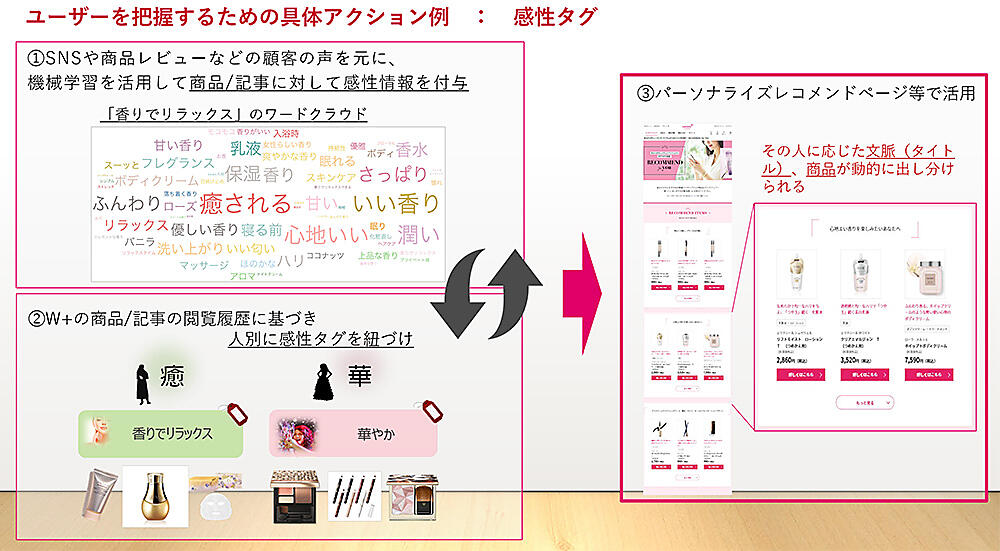商品のレビューやSNS上の声などを収集し、商品ごとにどういった反応があるかを検証。たとえば「香りでリラックス」「華やか」のような印象を持たれているとすれば、そうした反応をしているユーザーに対して「感性タグ」を付けていく。「香りでリラックス」するのが好きなユーザーの好みを掘り下げて、パーソナライズしたレコメンドを仕掛ける。