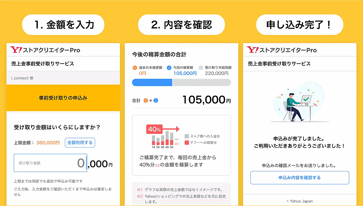 「Yahoo!ショッピング」出店者が将来にわたって計上する予定の売上金を、売り上げが発生する前に受け取れるサービス。将来発生する債権を事前に売却して資金化する手法「将来債権ファクタリング」を採用している。