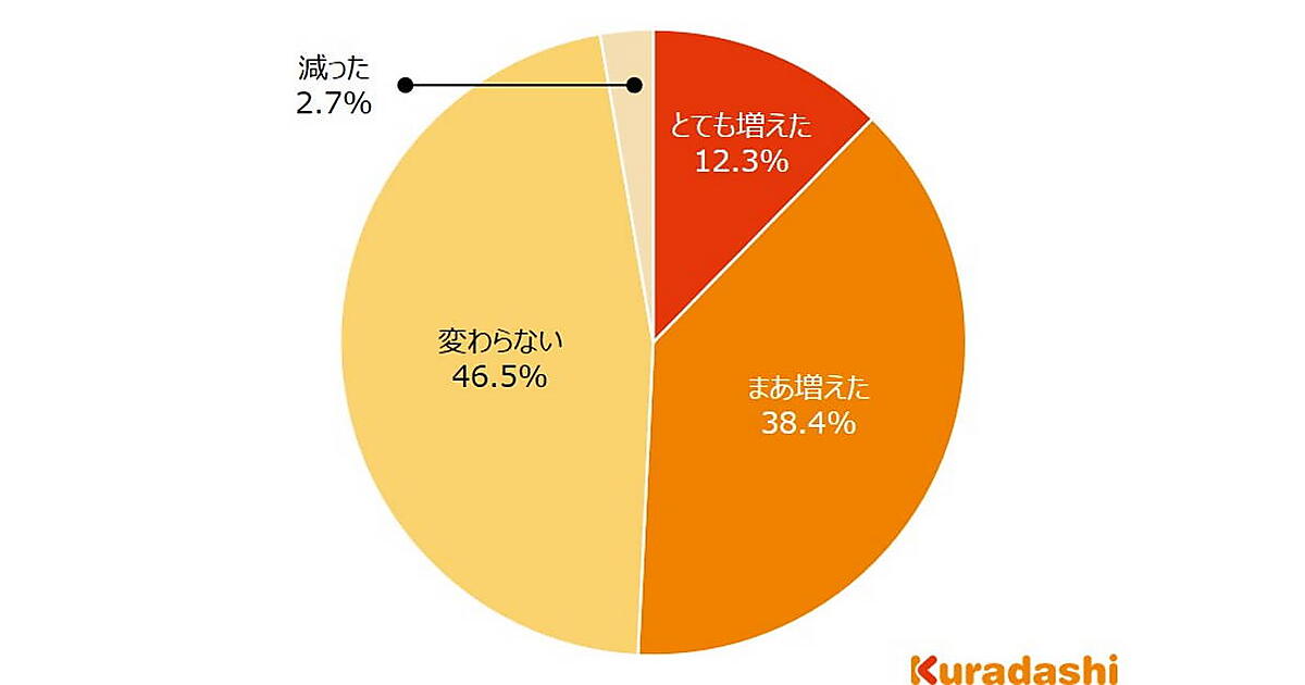 「昨今の食品の値上げを受けて、インターネットで食品を購入する機会はどのように変化したか」という質問に、12.3%が「とても増えた」、38.4%が「まあ増えた」と答えた。
