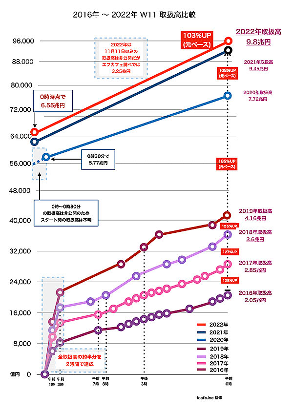 2020年、2021年と同様、2022年も11月11日だけの取扱高データは「Tmall」から公表されていませんが、エフカフェ調べでは3.7兆円となっています(2022年からイベント期間が変更され、11月10日20時~11月11日24時。2021年までの期間は、11月11日0時~11月11日24時)。