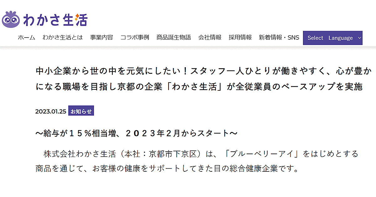 中小企業である弊社にとって本件は難しい判断だったが、共に働く仲間の不安を取り除き、心が豊かになる環境を整えることが、会社成長の基盤になると考えている。わかさ生活は目の総合健康企業のパイオニアとして、これからも世界中の目で悩んでいる方の未来を明るく照らす活動を続けていく。(わかさ生活)