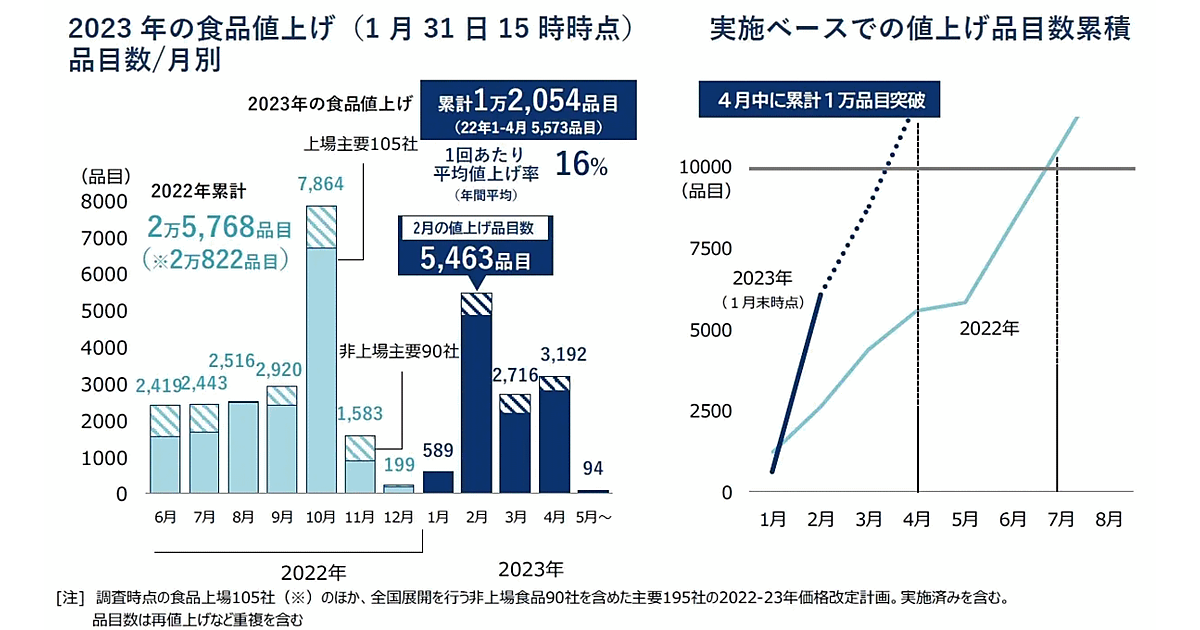 2023年1月31日までに決定した2023年中の飲食料品値上げ品目数は1万2054品目。上場する主要105社で1万482品目、非上場の主要90社で判明した値上げは1572品だった。このうち4月1日までの累計で1万品目を突破する。