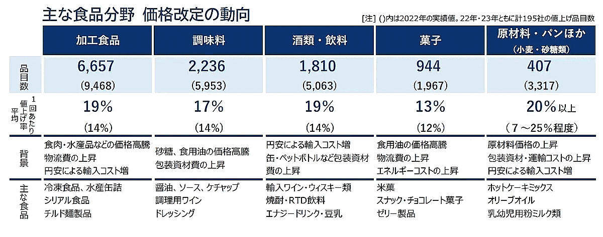 2023年の値上げは加工食品(6657品目)が最多で、チルド麺や缶詰製品のほか、ウィンナー製品の大規模値上げが予定されている。嗜好性の強い菓子(944品目)も、3月には最も多かった2022年9月の水準を上回る規模となる見通し。