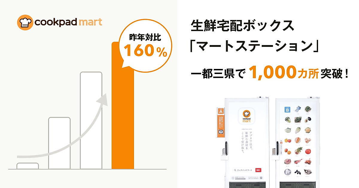 クックパッドは、生鮮食品EC「クックパッドマート」の生鮮品受け取りの宅配ボックス「マートステーション」の設置数が1000か所を突破したと公表した。今後はさらなる設置数の拡大とともに、「隠れ買い物困難者」ゼロをめざした実証実験に取り組む。