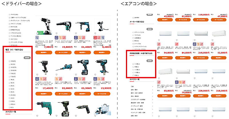 電動工具、家具・照明など、商品の種類に合わせて絞り込み項目が自動で切り替わり、スペックや使用目的に合わせた検索を実現する。