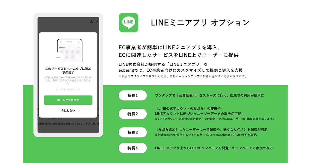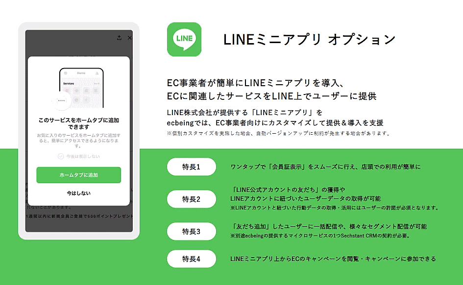 ecbeingは2021年から、EC事業者向けにLINEミニアプリの提供・導入支援を開始。ECサイト構築パッケージ「ecbeing」を導入しているEC事業者は、簡単にLINEミニアプリを導入できるようになった。