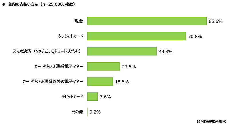 調査対象者全員に普段の支払い方法について聞いたところ、トップは「現金」(85.6%)で、次いで「クレジットカード」(70.8%)「スマホ決済(タッチ式、QRコード式含む)」(49.8%)だった。