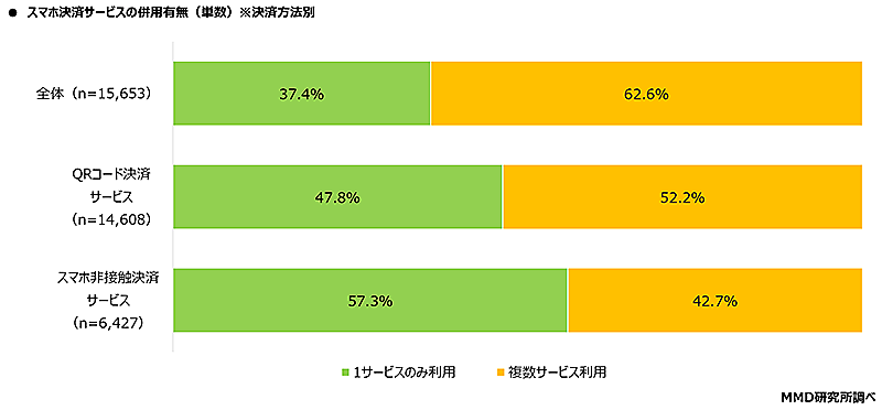MMD研究所が実施した「2023年1月スマートフォン決済利用動向調査 第1弾」によると、スマホ決済サービスを併用している割合は62.6%だった