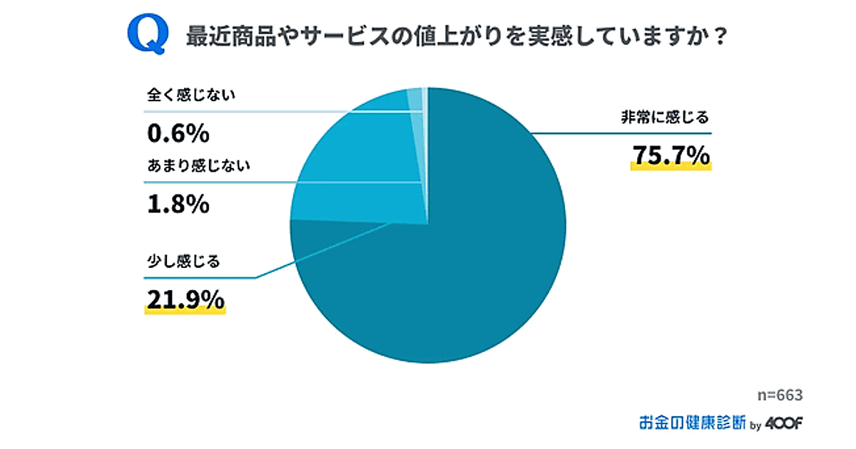 お金のオンライン相談サービス「お金の健康診断」を運営する400F(フォーハンドレッド・エフ)が実施した物価上昇と賃上げに関するアンケート調査によると、物価上昇を実感していると回答した割合は約98%に達した。