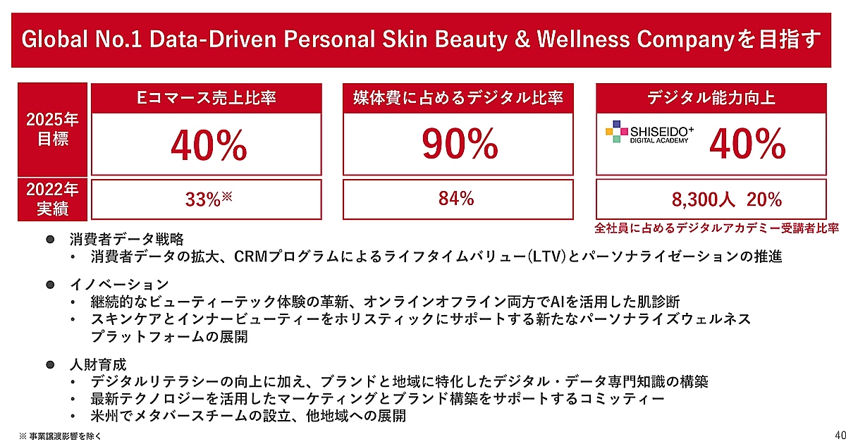 2025年にはグローバルEコマース売上比率40%をめざす。媒体費に占めるデジタル比率は引き続き90%で、特に日本と欧州事業にフォーカスしていく。