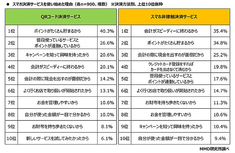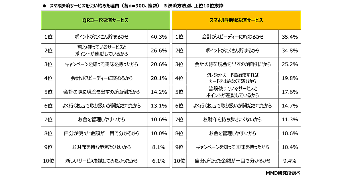 スマホ決済サービス使い始めた理由は「ポイントがたくさん貯まる」「会計がスピーディー」