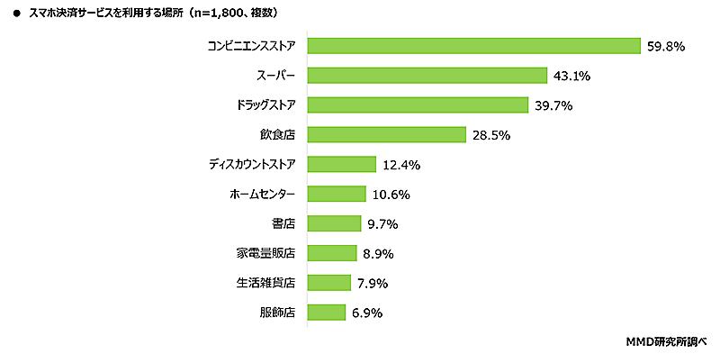 スマホ決済サービス利用場所の上位は「コンビニエンスストア」「スーパー」「ドラッグストア」