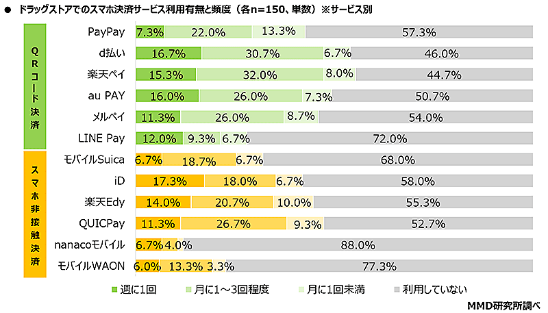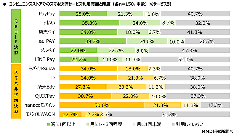 QRコード決済サービス(PayPay、d払い、楽天ペイ、au PAY、メルペイ、LINE Pay)、もしくはスマホ非接触決済サービス(モバイルSuica、iD、楽天Edy、QUICPay、nanacoモバイル、モバイルWAON)のいずれかのサービスをメイン利用している人(各n=150) - 有効回答:1800人