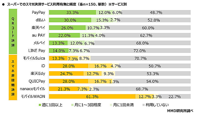 スーパーでは「モバイルWAON」ユーザーの77.3%、「PayPay」ユーザーの51.3%、「iD」ユーザーの49.3%が利用していることがわかった。