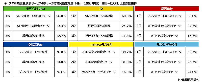 最も利用しているスマホ非接触決済サービス上位である「モバイルSuica」は「クレジットカードからのチャージ」(56.0%)、「iD」は「クレジットカードとの連携」(60.0%)がそれぞれトップだった。