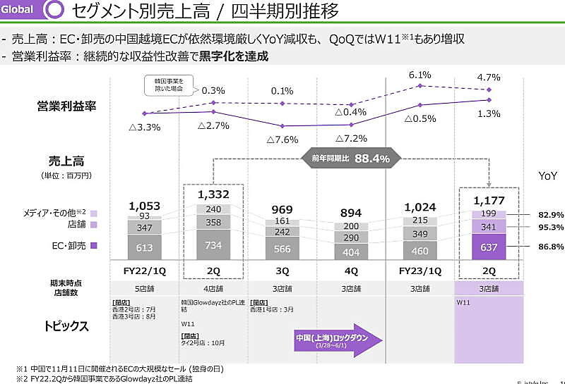 日本国外で展開するEC・卸売、店舗、メディアなどのサービスが属する「Global事業」単体の売上高は同7.7%減の22億100万円、営業損益は1000万円の黒字(前年同期は7100万円の営業損失)。