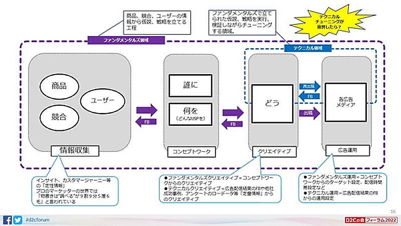 「ファンダメンタルズマーケティング」はこのプロセス全体を貫く概念だが、広告出稿して得られたフィードバックデータをもとにクリエイティブをチューニングして再出稿するプロセスは「テクニカルマーケティング」の領域となる。