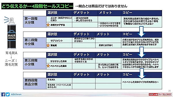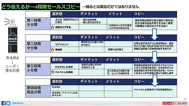 ただし、ベトベトした育毛剤は「塗った後、髪型に影響を与えてしまう」というデメリットもある。自社がどのような商品を扱っているかによって、競合商品のデメリットと自社商品のメリットを考える必要がある。