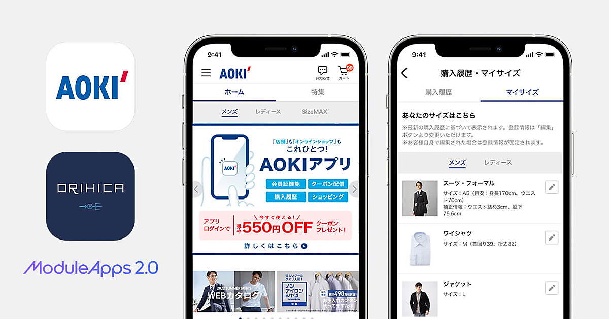 紳士服の企画販売を手がけるAOKIは、「AOKI公式アプリ」とビジネスウェアブランドの「ORIHICA(オリヒカ)公式アプリ」リニューアルした。