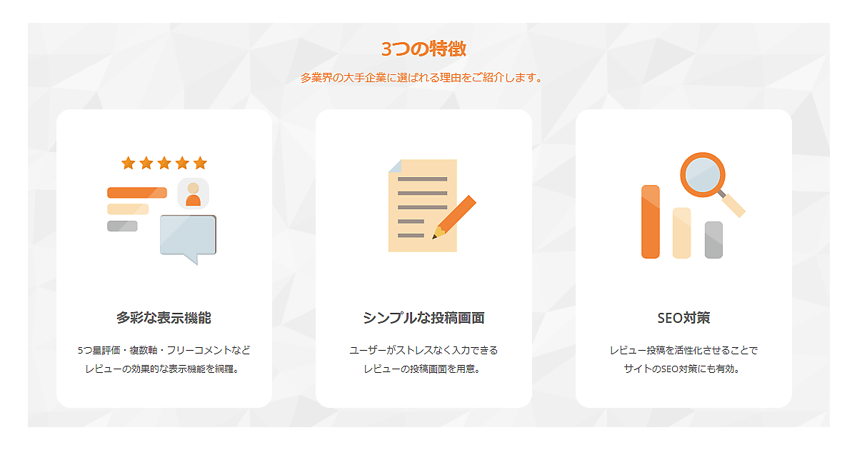 サイト自体や提供する商品・サービスに対して、複数の評価軸を用いた多面な評価によるレビューコンテンツをサイトに実装できるエンジン。点数による評価やフリーコメント、スタッフレスポンスなどの機能を有するほか、投稿レビューデータの分析、A/Bテストでの活用ができる。