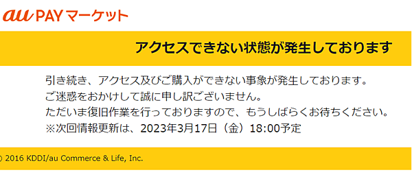 ※【追記】3月17日(金) 17:55頃に「au PAY マーケット」は復旧しました。