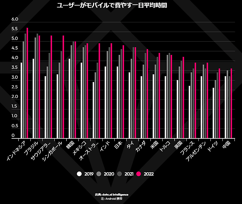 世界の上位10市場における1日あたりのモバイル利用時間は平均5時間6分で、2020年から9%増加した。