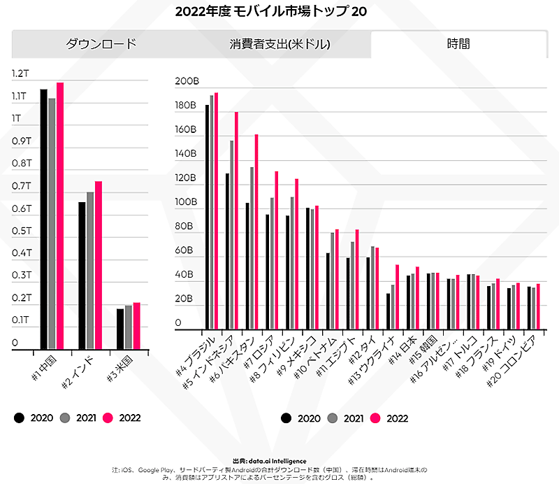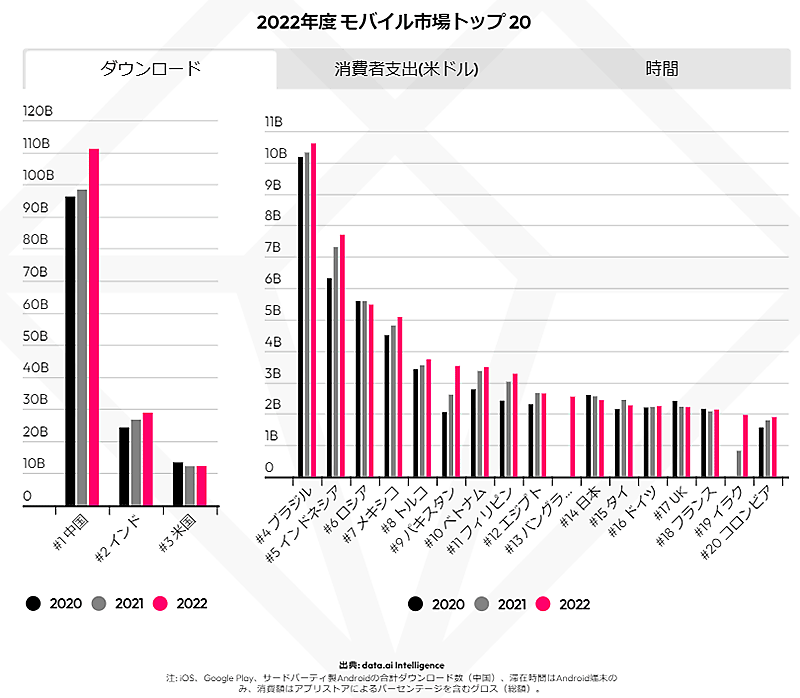 各項目について、モバイル市場トップ20か国の状況を発表しており、ダウンロード数が最も多かったのは中国、次いでインド、米国だった。
