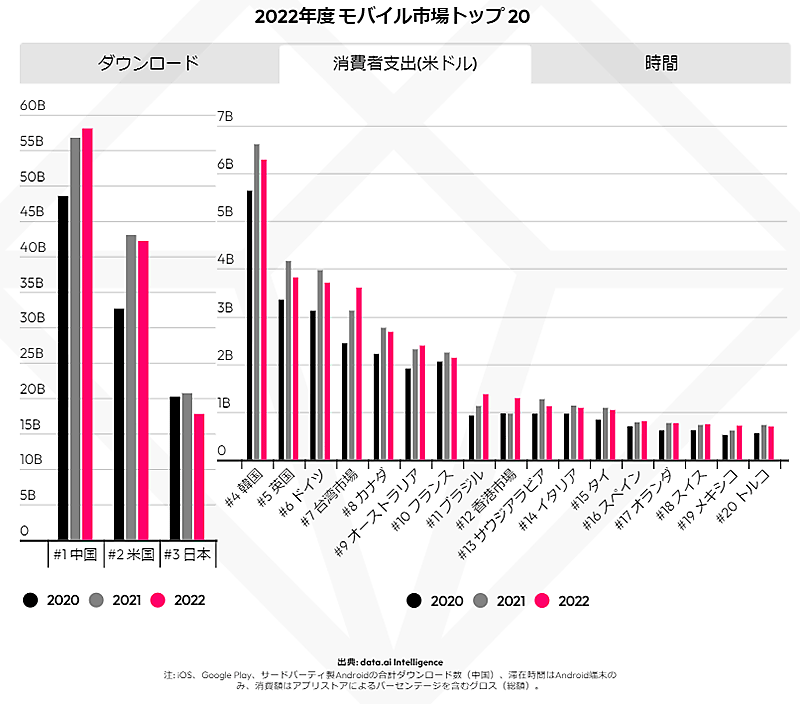 この結果について、data.aiの矢野恵介氏(既存事業責任者)は、「アプリのダウンロード数が増加している一方で、消費者支出額が昨対でマイナス成長となったのは、モバイル市場調査を開始してから初めての現象だ」と話す。