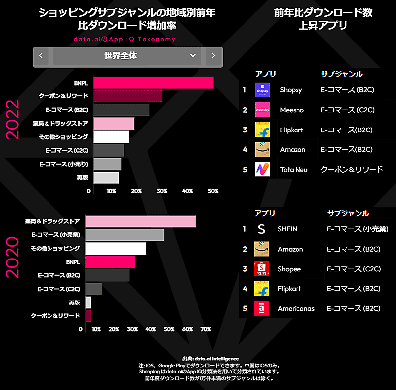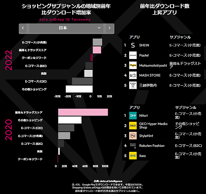 2022年の日本では、「SHEIN(シーイン)」の前年比アプリダウンロード数が上昇した。また、急上昇ダウンロード数を見ると、10位以内に「マツモトキヨシ」「ココカラファイン」といったドラッグストアがランクインしている特徴がある。