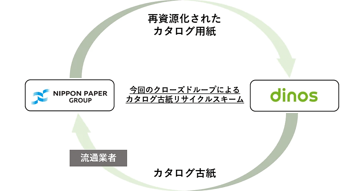カタログ用紙の調達先である日本製紙と連携。DINOS CORPORATIONが発行したカタログ(顧客への配布用と書店販売用)の古紙を、流通業者を経由して日本製紙が買い受け、石巻工場で再資源化する。