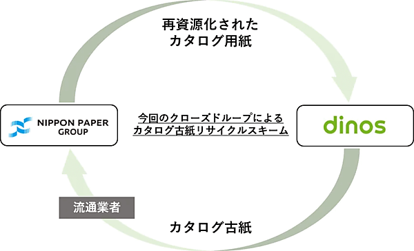 DINOS CORPORATIONと日本製紙は、消費された製品を新たな資源と捉えて再製品化する「クローズド・ループ」の形式で、カタログ古紙を国内循環させる。