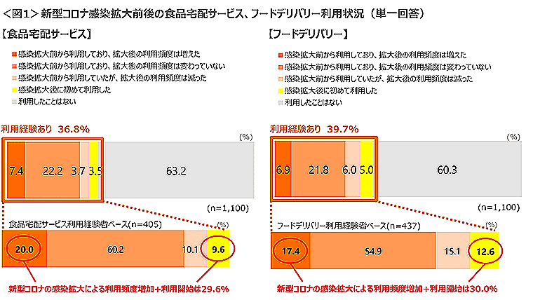 古くから出前文化が根付いている日本でも、コロナ禍は特に大きな契機となり、デリバリーサービスの需要は急拡大。クロス・マーケティングの「食品宅配サービス・フードデリバリーに関する調査」によると、新型コロナウイルス感染拡大後の消費者のフードデリバリー利用経験率は、約4割にのぼった。