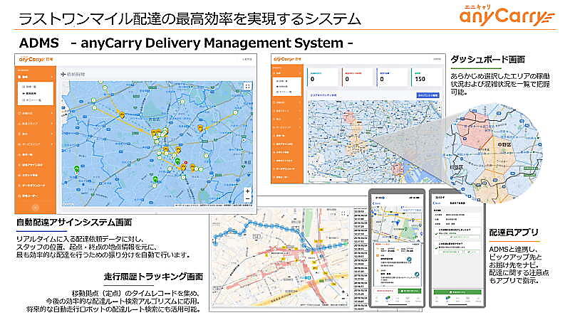 こうしたエニキャリの柔軟かつ効率的なデリバリーを叶える上で、肝となっているのが「ADMS」だ。リアルタイムに入る配達依頼データに対し、配達員の位置やデリバリーの起点・終点の情報をもとに最適な振り分けを自動で行うほか、蓄積したデータから効率的な配達ができる機能などを搭載。「ADMS」は自社で配達員を抱えてデリバリー事業を手掛ける事業者も利用でき、日本マクドナルドの自社デリバリーにも採用されている。