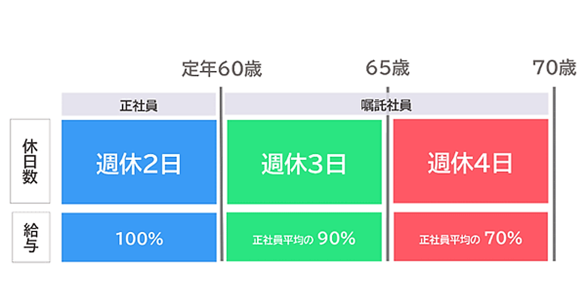 ジャパネットグループの定年は60歳。定年後は嘱託社員として再雇用する。65歳までは公休数は週休3日で、定年前と比較して勤務日数は8割程度に減るが、給与・手当は平均支給額の9割を担保する設計にした。65歳以降は週休4日で、給与・手当は正社員平均の7割になる。