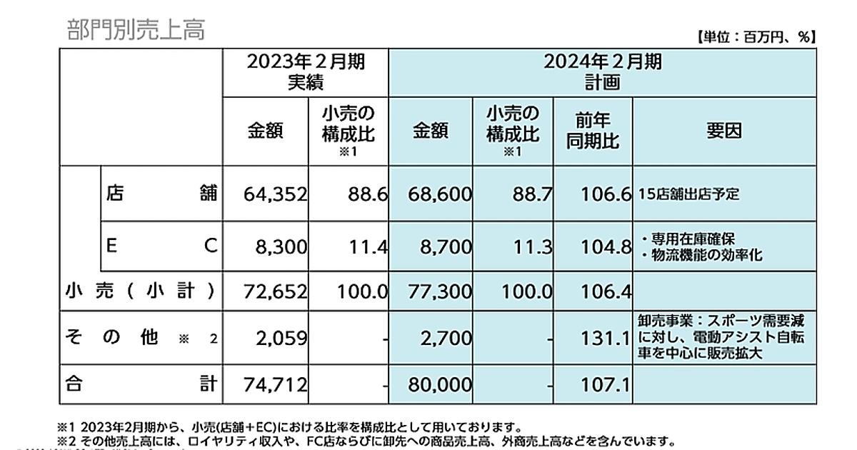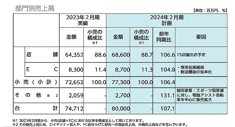 2024年2月期の売上高は、同7.1%増の800億円を計画している。このうち小売売上高は同6.4%増の773億円。内訳は店舗が同6.6%増の686億円、ECは同4.8%増となる87億円を見込んでいる。