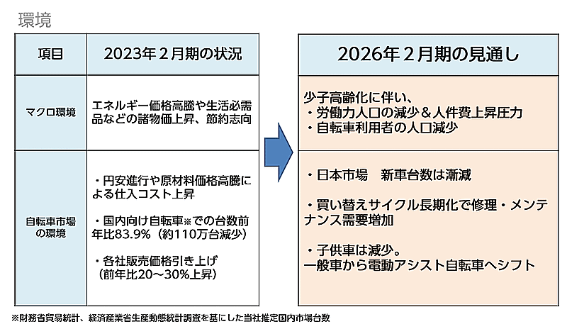 あさひは2026年2月期を最終年度とした3か年の中期経営計画「VISION2025」を策定。マクロ環境については2026年、少子高齢化に伴い、労働力人口の減少と人件費圧力が上昇すると予想。自転車利用者の減少も見込んでいる。