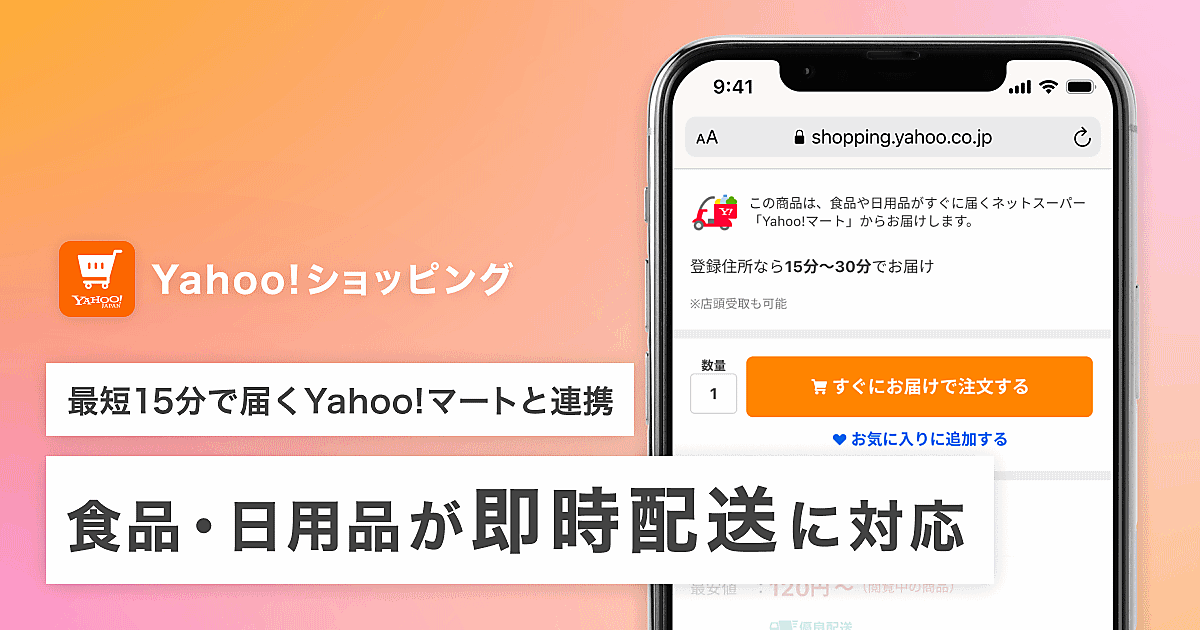 ヤフーは、「Yahoo!ショッピング」の検索画面に、最短15分で食料品や日用品などを宅配する「Yahoo!マート」の商品を掲出し、即時配送する取り組みを始めた。