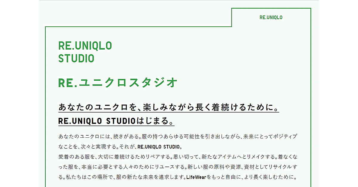 「RE.UNIQLO STUDIO」は2022年10月にユニクロ世田谷千歳台店で始まったサービスで、服の新たな未来を追求する専用スペースにてリペアサービスやリメイクなどのカスタマイズサービスを提供してきた(以下参照)。
