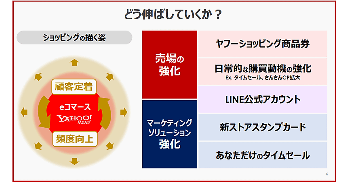 ヤフーは「2020年代前半に国内物販EC取扱高No.1」というeコマース取扱高に関する経営目標を変更。従来の「ポイント・販促中心」から、「グループアセットを最大限活用することに注力し、成長と収益性のバランスを両立」に変えた。