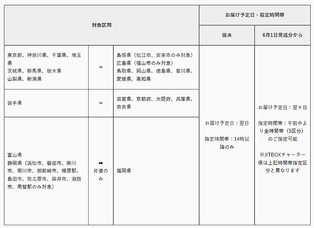 対象区間(以下を参照)の荷物は従来、受け取った翌日に配送できた。6月1日からは「翌々日」に変更する。時間帯指定は午前中から全時間帯(5区分)指定可能。