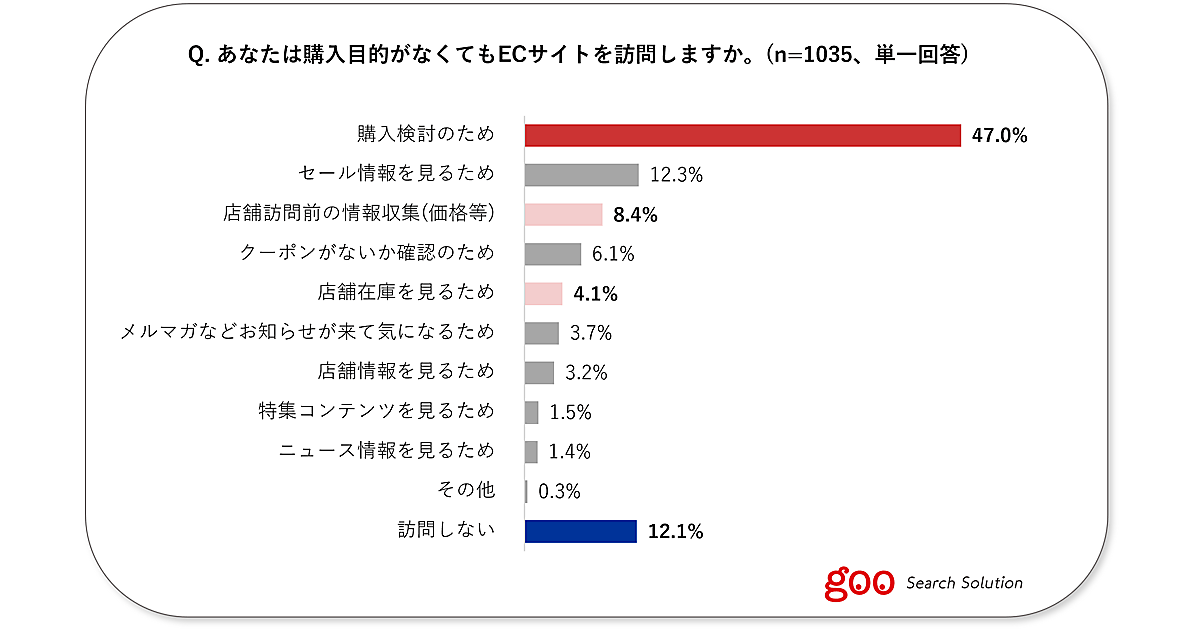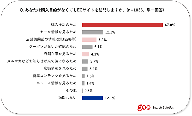 ECサイトユーザーの87.9%が「購入目的がなくてもECサイトを訪問する」と答えた。その理由は「購入検討のため」(47.0%)が最多。「店舗訪問前の情報収集(価格など)」(8.4%)、「店舗在庫を見るため」(4.1%)といった回答のように、実店舗への訪問意欲が高いと思われる利用動向もあった。