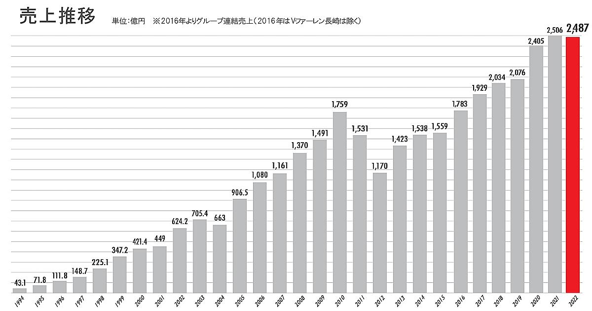 コロナ禍に入った2020年12月期の売上高は2405億円で同15.8%増の2ケタ増収。2021年12月期はコロナ需要が一服したものの、同4.2%の増収で過去最高を更新した。2022年12月期は店舗回帰の消費行動などが影響したと見られる。
