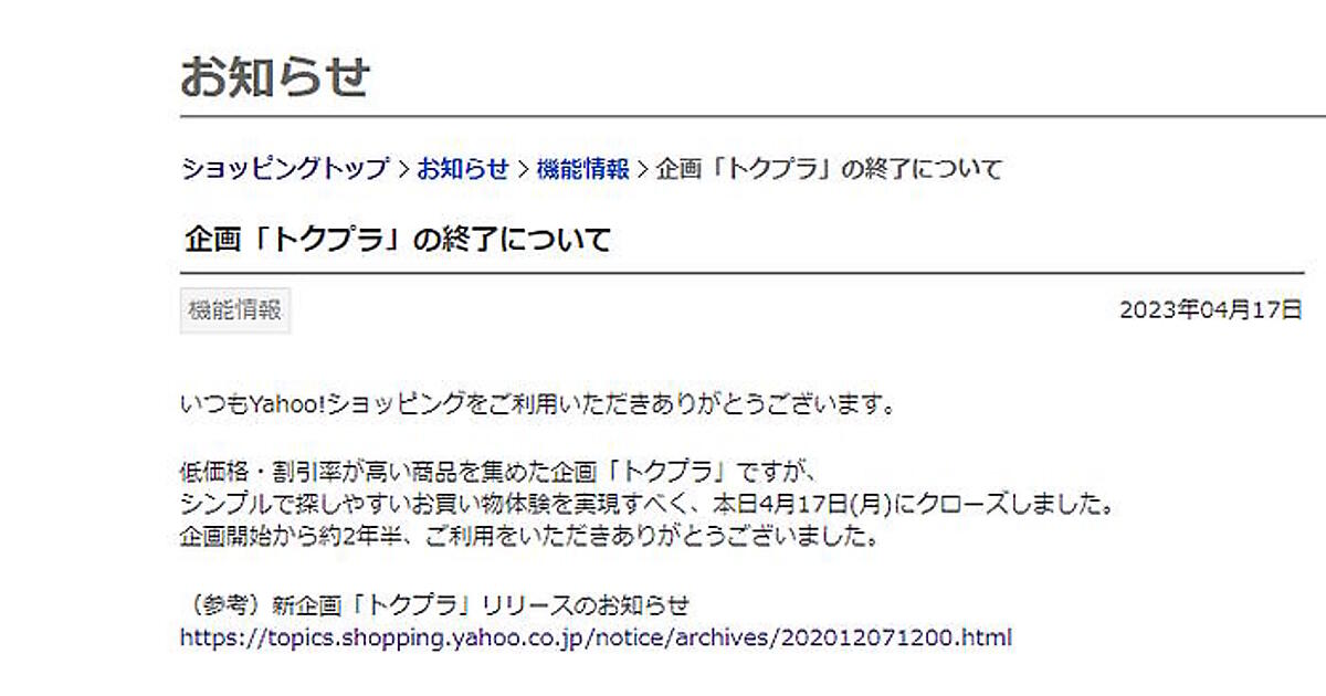 ヤフーは4月17日、「Yahoo!ショッピング」で展開していた、低価格・割引率が高い商品を集めた企画「トクプラ」を終了した。