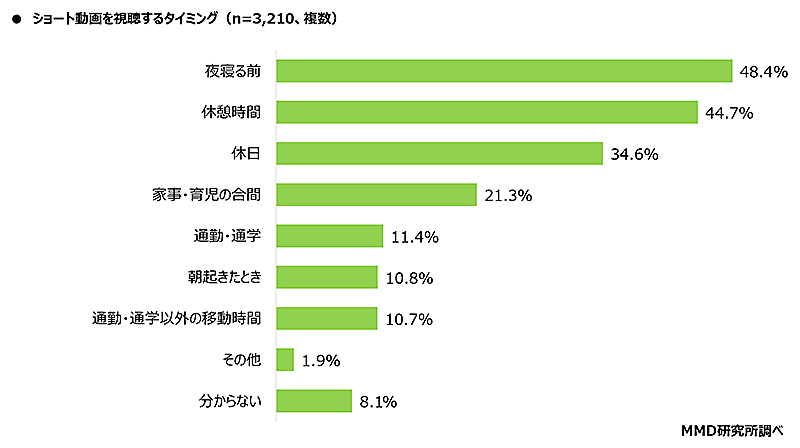 「ショート動画を視聴している」と回答した人に視聴するタイミングを聞いたところ、最多は「夜寝る前」(48.4%)、次いで「休憩時間」(44.7%)「休日」(34.6%)だった。