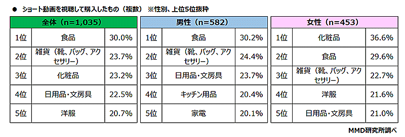 購入した商品、男性は「食品」、女性は「化粧品」がトップ