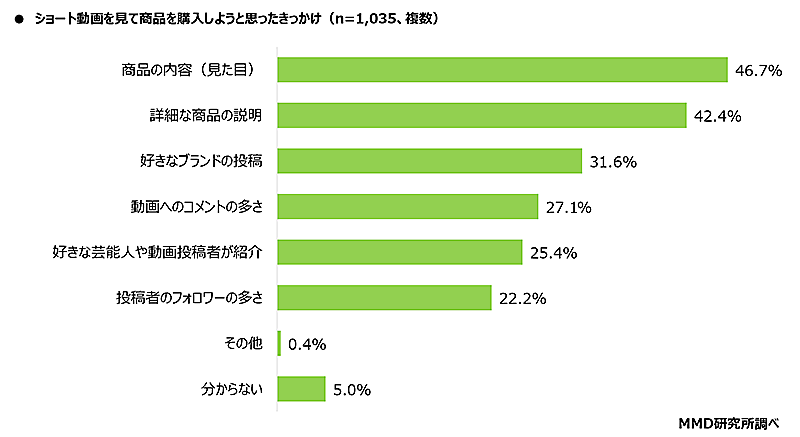 ショート動画を視聴して商品を購入しようと思ったきっかけを聞いたところ、「商品の内容(見た目)」(46.7%)が最も多く、次いで「詳細な商品の説明」(42.4%)「好きなブランドが投稿」(31.6%)だった。