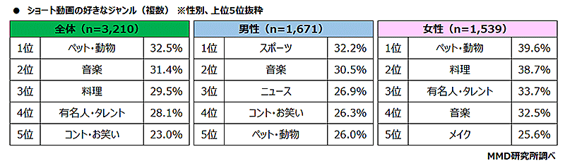 ショート動画の好きなジャンル、男性は「スポーツ」女性は「ペット・動物」がトップ
